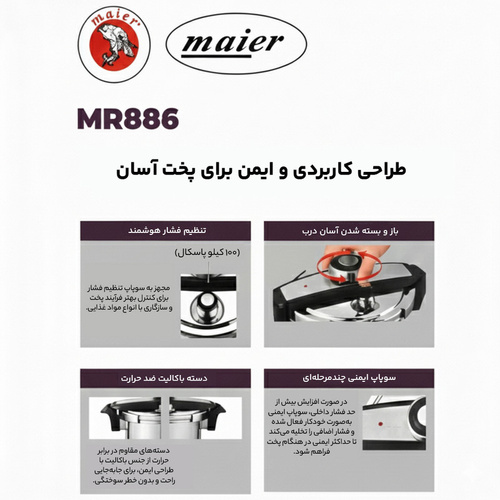 زودپز دوقلو مایر مدل MR886 با گنجایشهای 6 و 8 لیتر ترکیبی از طراحی هوشمندانه، ایمنی بالا و عملکرد حرفهای است. این محصول از استیل ضدزنگ با کیفیت بالا 18/10 ساخته شده که علاوه بر دوام طولانی، مقاومت در برابر زنگزدگی و سهولت در شستوشو را تضمین میکند. طراحی خاص این زودپز امکان استفاده روی انواع اجاقها از جمله گازی، برقی و القایی (Induction) را فراهم میکند و با پخت سریعتر غذا، طعم و ارزش غذایی مواد را حفظ و تقویت میکند. سیستم فشار و ایمنی این مدل به گونهای طراحی شده که پخت ایمن و مطمئن را تضمین میکند. سوپاپ تنظیم فشار قابل انتخاب به شما امکان میدهد متناسب با نوع مواد غذایی و روش پخت، فشار داخلی را کنترل کنید. همچنین سوپاپ ایمنی هوشمند بهطور خودکار در صورت رسیدن فشار داخلی به حد مجاز فعال میشود و از باز شدن ناگهانی درب جلوگیری میکند. پس از پایان فرآیند پخت و تخلیه کامل فشار، امکان باز کردن درب بهراحتی فراهم میشود. دستههای باکالیت ضد حرارت این زودپز تجربهای راحت و ایمن از جابهجایی و سرو غذا فراهم میکنند. محافظ شعله استیل موجود در طراحی آن باعث افزایش دوام و ایمنی در حین استفاده میشود. برای اطمینان از عملکرد صحیح سیستم ایمنی، نگهداری و تمیز کردن منظم سوپاپ اهمیت ویژهای دارد. با توجه به گنجایشهای 6 و 8 لیتری، زودپز دوقلو مایر MR886 برای خانوادههای کوچک و بزرگ مناسب بوده و امکان پخت همزمان حجمهای متفاوت غذا را فراهم میکند، بدون آنکه طعم یا کیفیت کاهش یابد. این محصول ترکیبی از ایمنی، راحتی و کیفیت بالا است که تجربه پختی سریع، سالم و لذیذ را به کاربران ارائه میدهد.